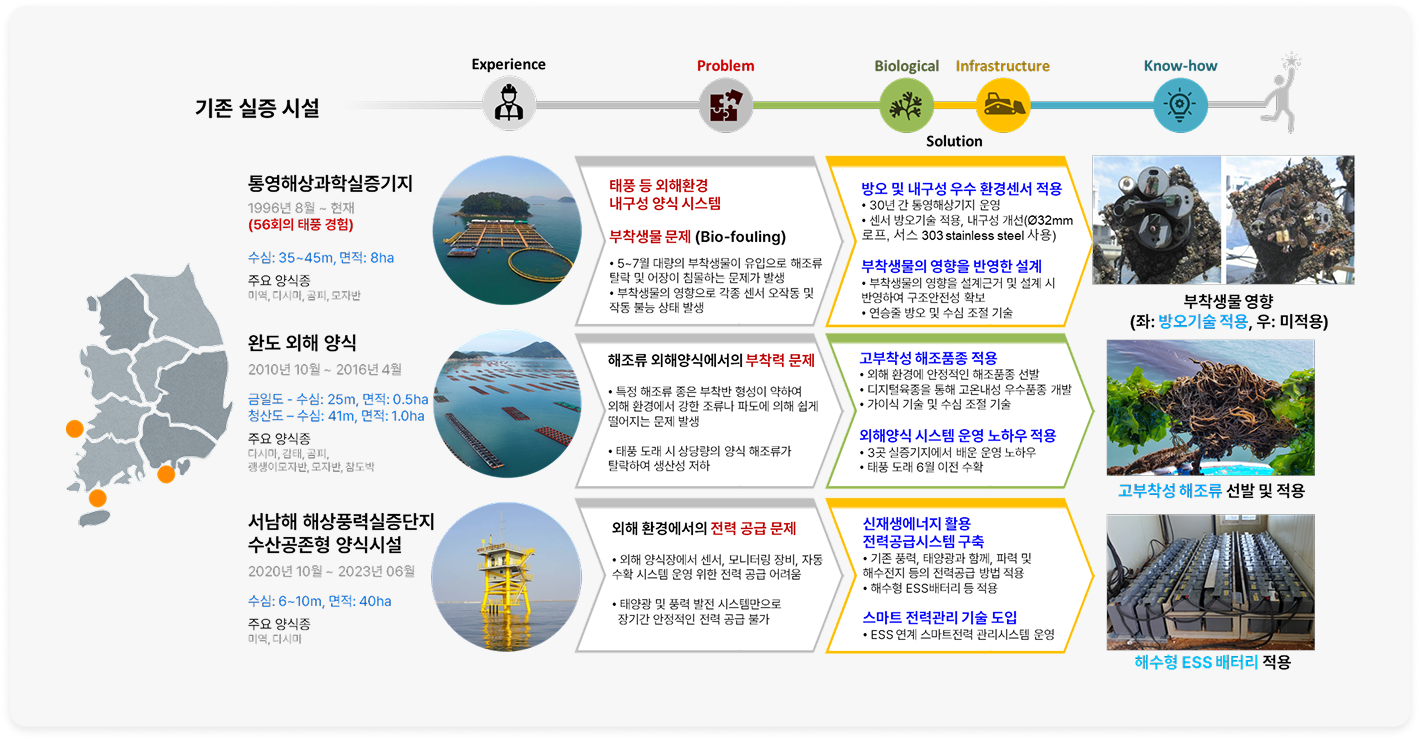 쌓아왔습니다. 태풍 등의 외해환경에 견디는 내구성 높은 시설이 필요하고, 여름에 주로 발생하는 부착생물이 센서